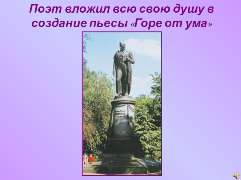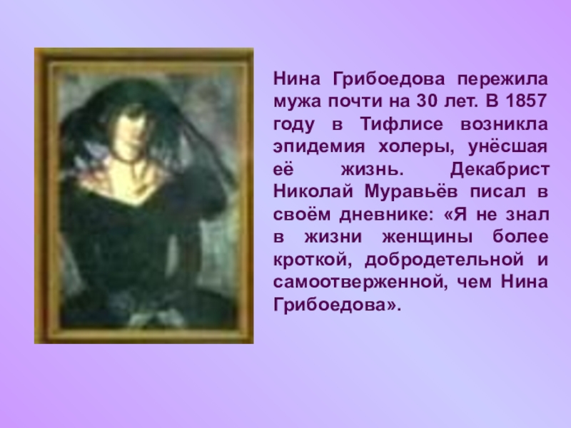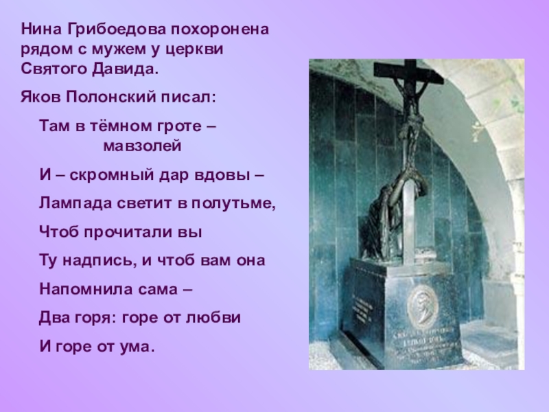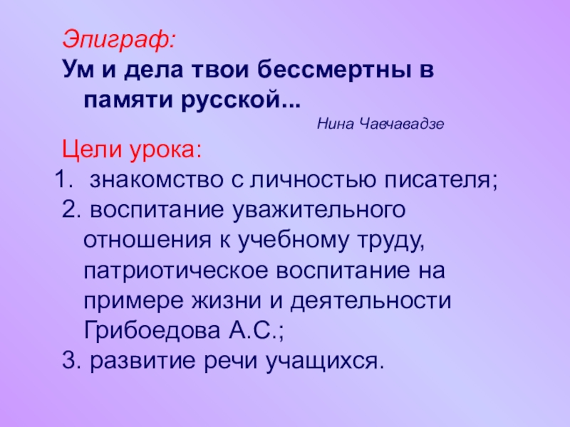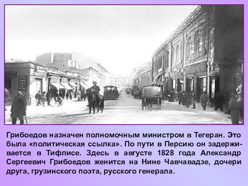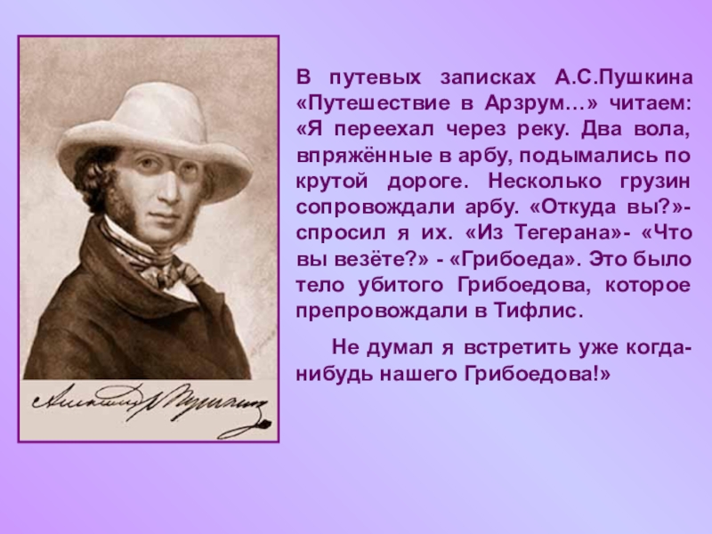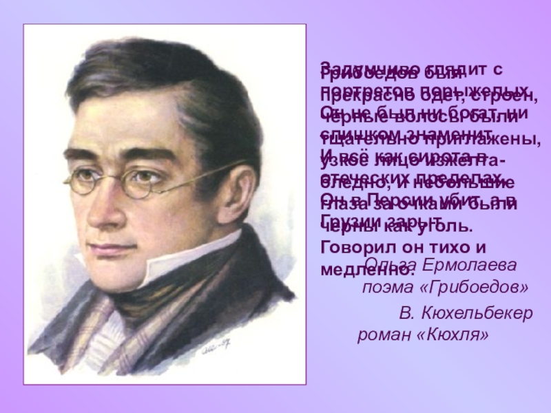 Грибоедов был прекрасно одет, строен, чёрные волосы были тщательно приглажены, узкое лицо изжелта-бледно, и небольшие глаза за очками были черны как уголь. Говорил он тихо и медленно.