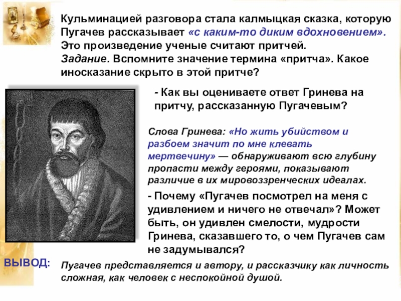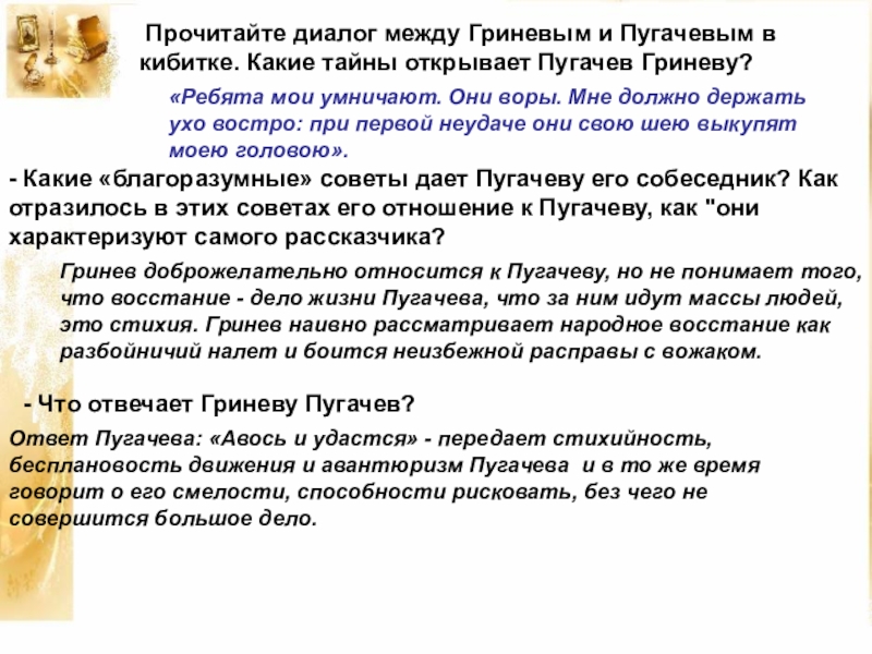 - Почему «Пугачев посмотрел на меня с удивлением и ничего не отвечал»? Может быть, он удивлен смелости, мудрости Гринева, сказавшего то, о чем Пугачев сам не задумывался?