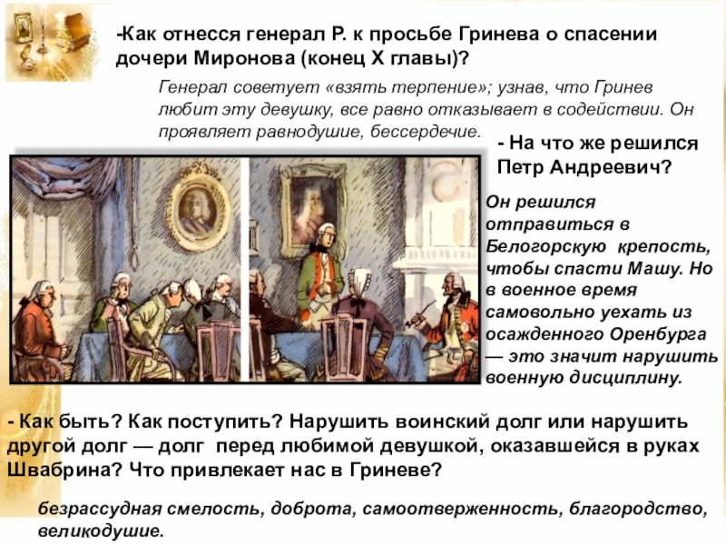 - Как быть? Как поступить? Нарушить воинский долг или нарушить другой долг — долг перед любимой девушкой, оказавшейся в руках Швабрина? Что привлекает нас в Гриневе?