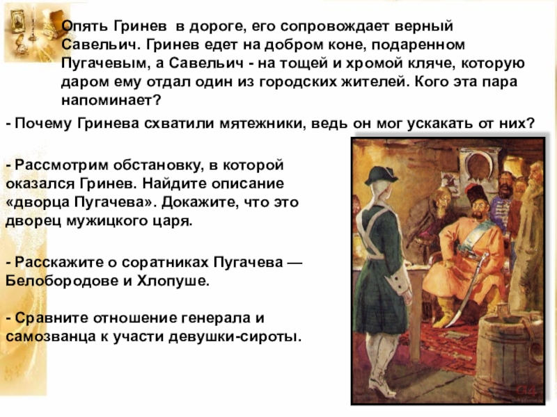 - Рассмотрим обстановку, в которой оказался Гринев. Найдите описание «дворца Пугачева». Докажите, что это дворец мужицкого царя.