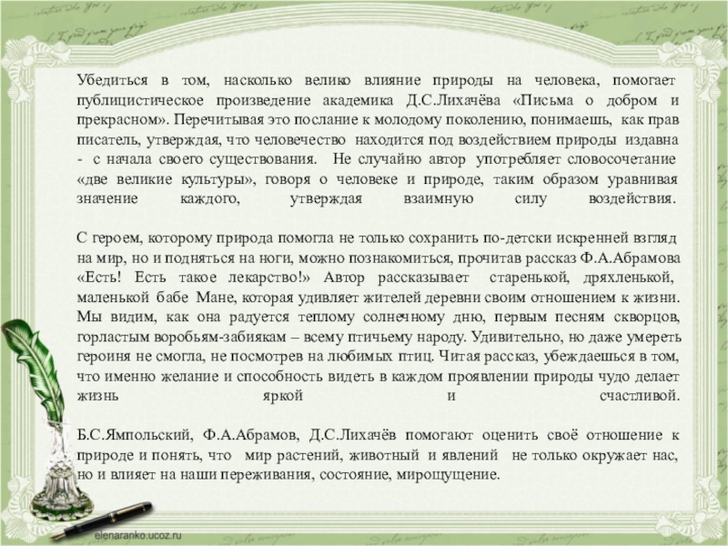 2. Чувство природы помогает человеку быть счастливым, с ним человек обретает важную точку отсчёта всех ценностей жизни.
