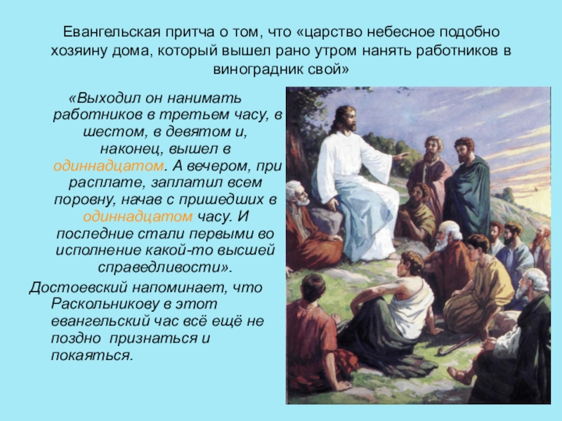 «Выходил он нанимать работников в третьем часу, в шестом, в девятом и, наконец, вышел в одиннадцатом. А вечером, при расплате, заплатил всем поровну, начав с пришедших в одиннадцатом часу. И последние стали первыми во исполнение какой-то высшей справедливости».