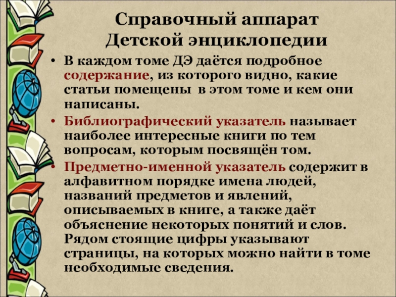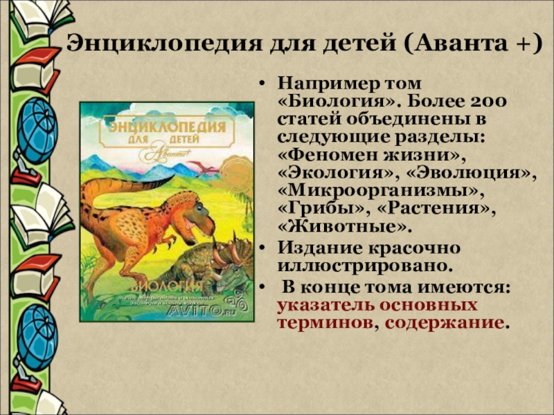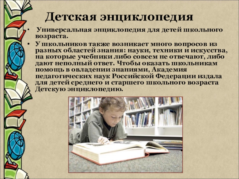 возникает много вопросов из разных областей знания: науки, техники и искусства, на которые учебники либо совсем не отвечают, либо дают неполный ответ. Чтобы оказать школьникам помощь в овладении знаниями, Академия педагогических наук Российской Федерации издала для детей среднего и старшего школьного возраста Детскую энциклопедию.