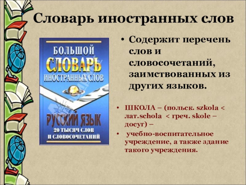 Содержит перечень слов и словосочетаний, заимствованных из других языков.