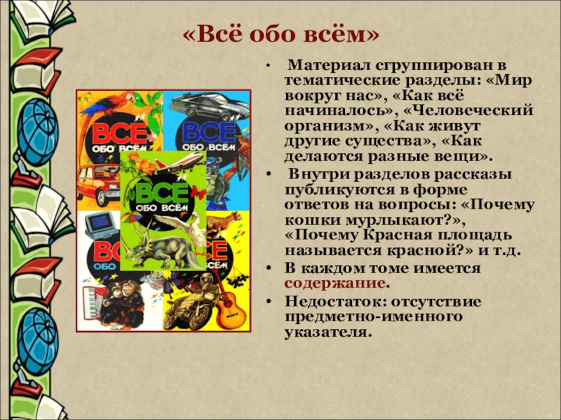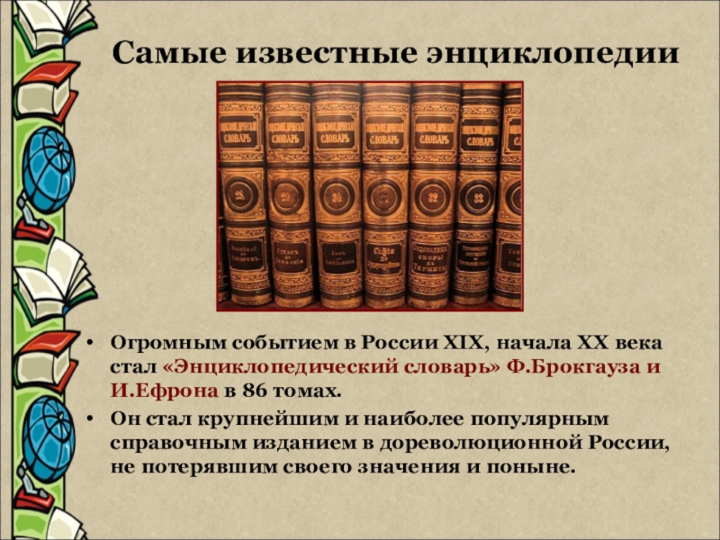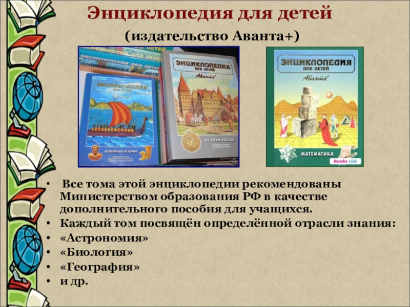 энциклопедии содержат информацию по отдельным отраслям знания.