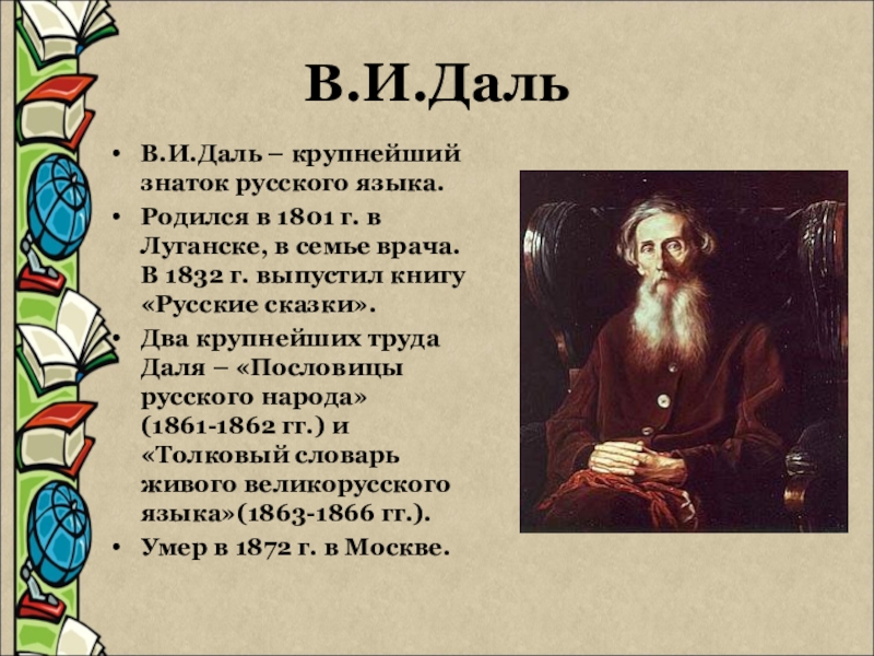 Два крупнейших труда Даля – «Пословицы русского народа» (1861-1862 гг.) и «Толковый словарь живого великорусского языка»(1863-1866 гг.).