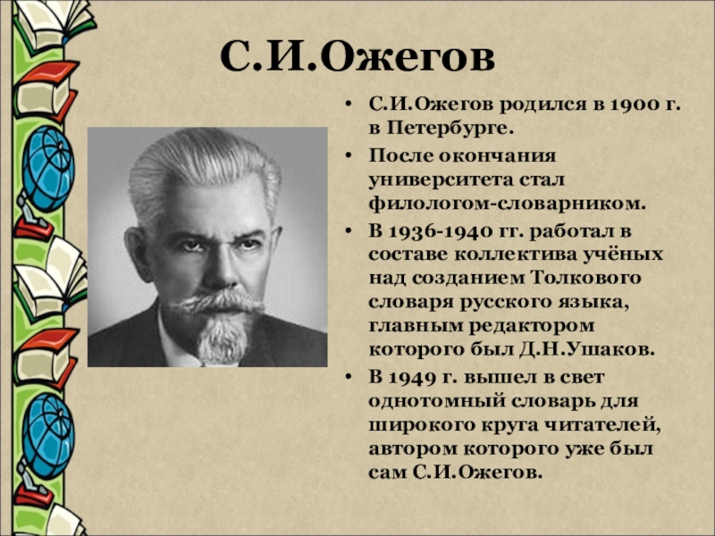С.И.Ожегов родился в 1900 г. в Петербурге.