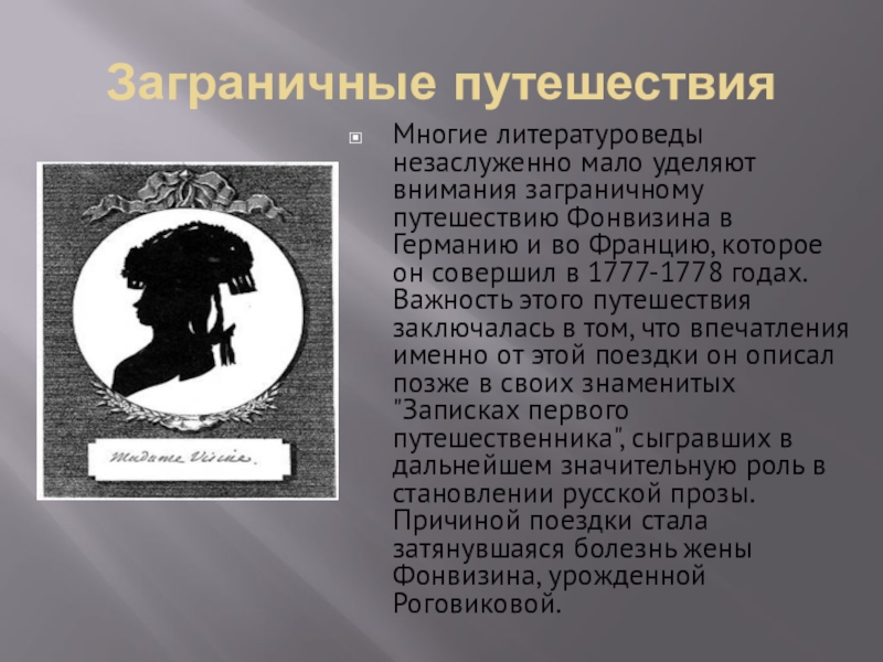 Германию и во Францию, которое он совершил в 1777-1778 годах. Важность этого путешествия заключалась в том, что впечатления именно от этой поездки он описал позже в своих знаменитых "Записках первого путешественника", сыгравших в дальнейшем значительную роль в становлении русской прозы. Причиной поездки стала затянувшаяся болезнь жены Фонвизина, урожденной Роговиковой.