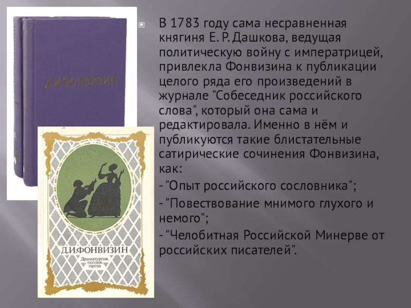войну с императрицей, привлекла Фонвизина к публикации целого ряда его произведений в журнале "Собеседник российского слова", который она сама и редактировала. Именно в нём и публикуются такие блистательные сатирические сочинения Фонвизина, как: