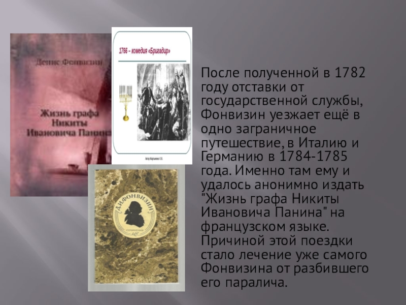 ещё в одно заграничное путешествие, в Италию и Германию в 1784-1785 года. Именно там ему и удалось анонимно издать "Жизнь графа Никиты Ивановича Панина" на французском языке. Причиной этой поездки стало лечение уже самого Фонвизина от разбившего его паралича.