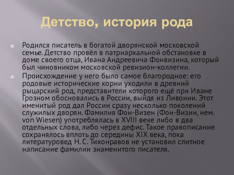 в патриархальной обстановке в доме своего отца, Ивана Андреевича Фонвизина, который был чиновником московской ревизион-коллегии.