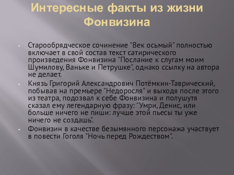 Слайд 16Интересные факты из жизни Фонвизина