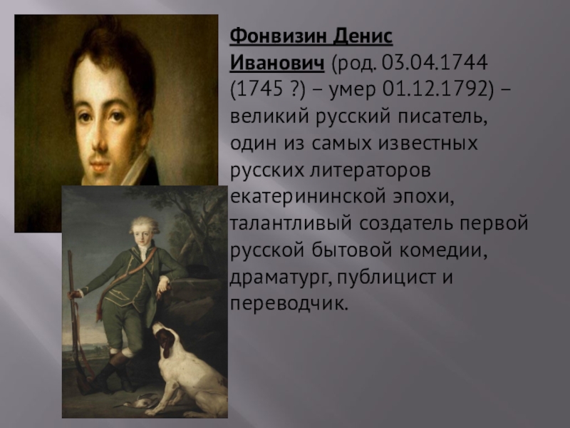 Слайд 2Фонвизин Денис Иванович (род. 03.04.1744 (1745 ?) – умер 01.12.1792) – великий