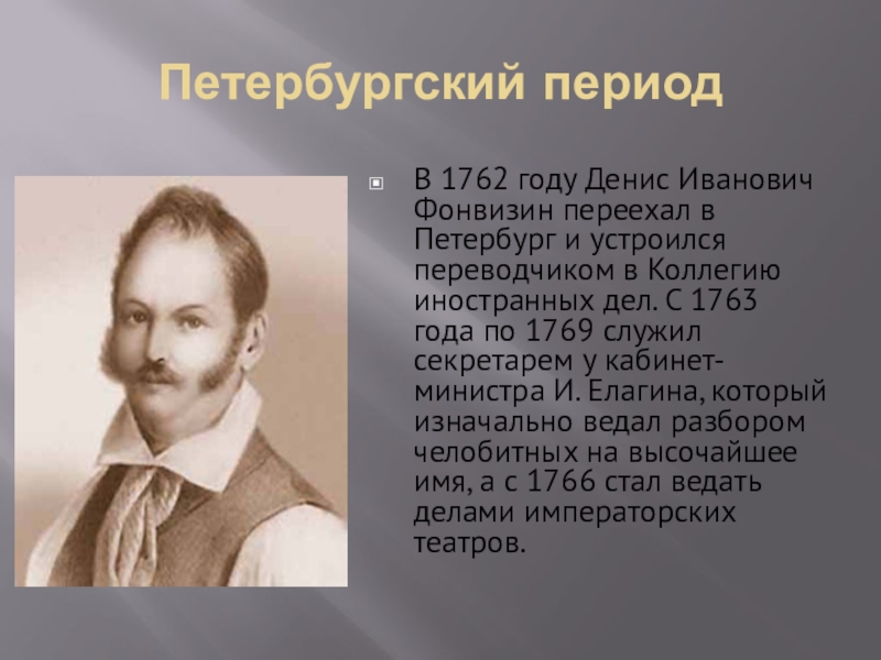 В 1762 году Денис Иванович Фонвизин переехал в Петербург и