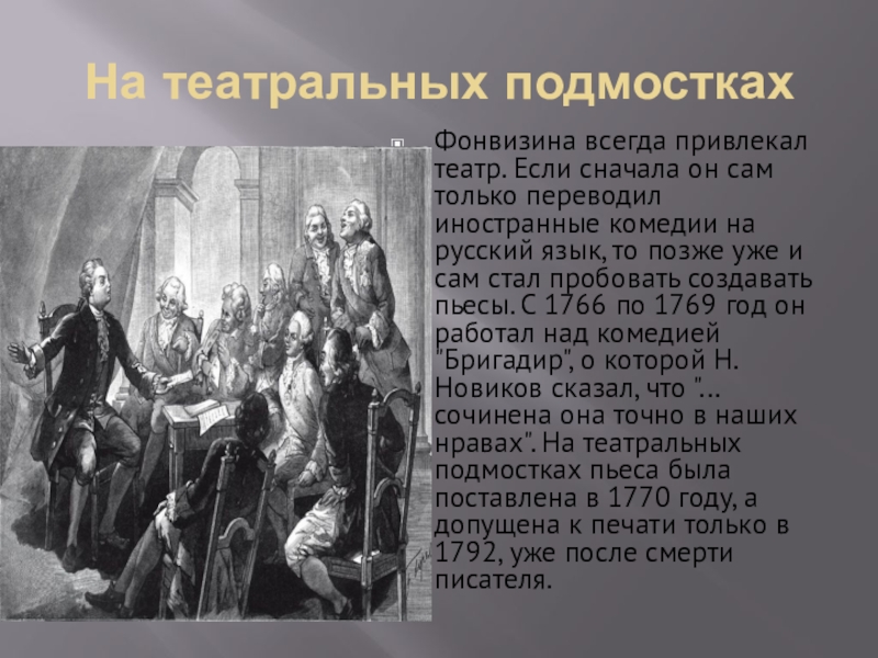 переводил иностранные комедии на русский язык, то позже уже и сам стал пробовать создавать пьесы. С 1766 по 1769 год он работал над комедией "Бригадир", о которой Н. Новиков сказал, что "...сочинена она точно в наших нравах". На театральных подмостках пьеса была поставлена в 1770 году, а допущена к печати только в 1792, уже после смерти писателя.