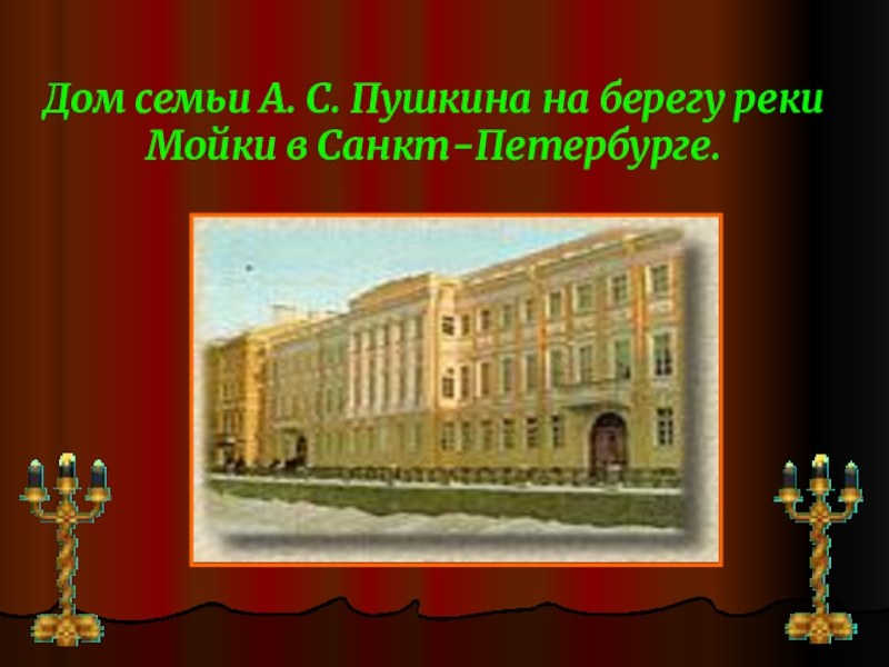 Слайд 42Дом семьи А. С. Пушкина на берегу реки Мойки в Санкт-Петербурге.