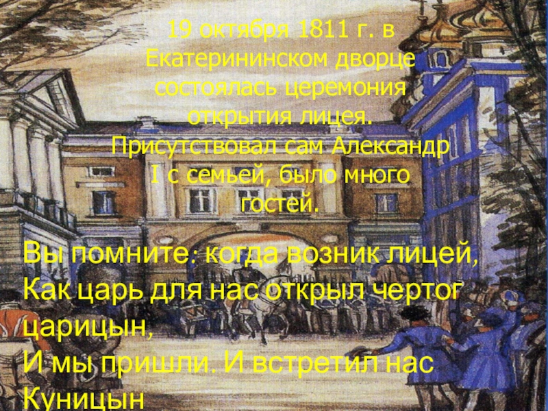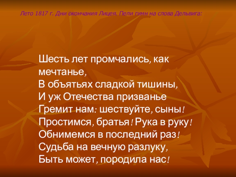 Слайд 27Лето 1817 г. Дни окончания Лицея. Пели гимн на слова Дельвига: