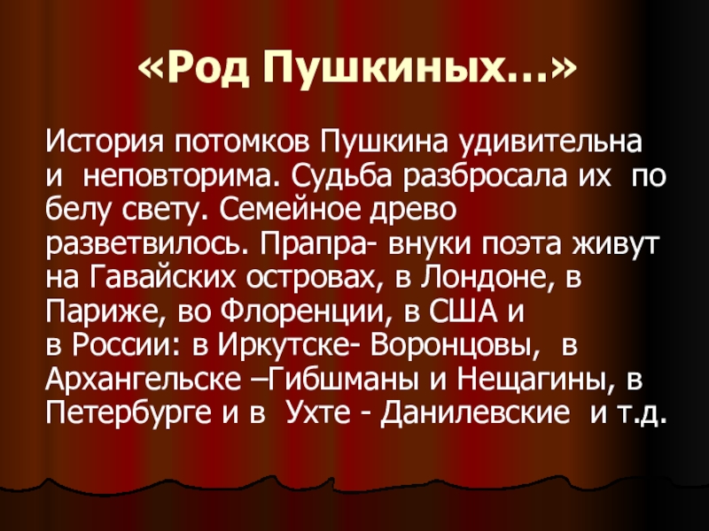 белу свету. Семейное древо разветвилось. Прапра- внуки поэта живут на Гавайских островах, в Лондоне, в Париже, во Флоренции, в США и