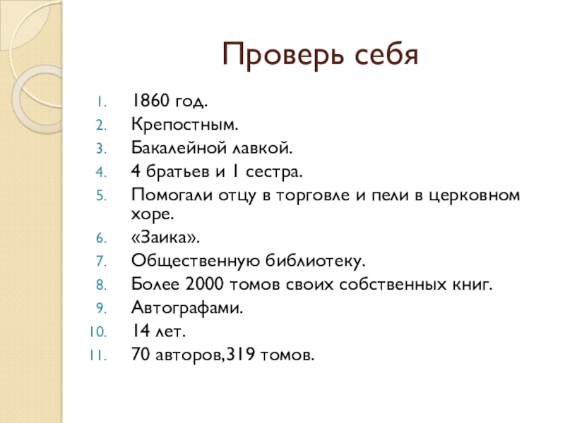Проверь себя1860 год.Крепостным.Бакалейной лавкой.4 братьев и 1 сестра.Помогали отцу в торговле и пели в церковном хоре.«Заика».Общественную библиотеку.Более