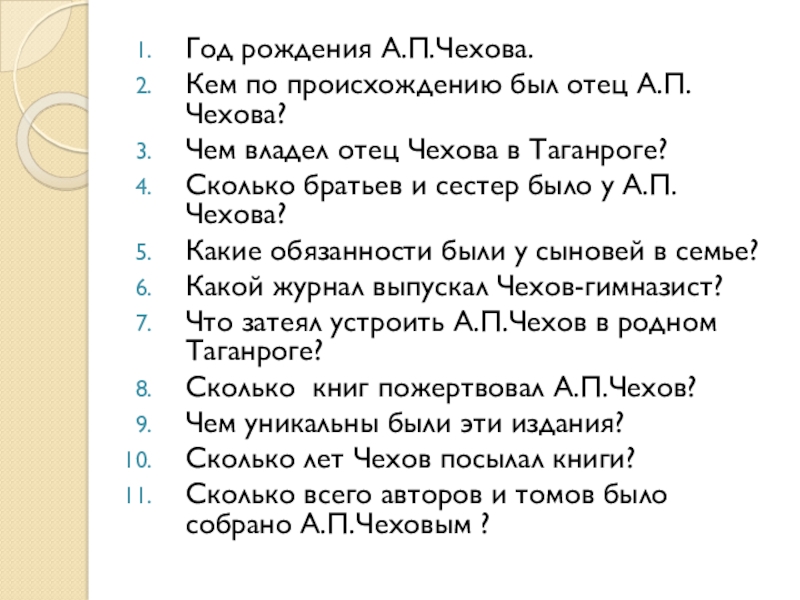 Год рождения А.П.Чехова.Кем по происхождению был отец А.П.Чехова?Чем владел отец Чехова в Таганроге?Сколько братьев и сестер было у А.П.Чехова?Какие обязанности были у сыновей в семье?Какой журнал выпускал Чехов-гимназист?Что затеял устроить А.П.Чехов в родном Таганроге?Сколько книг пожертвовал