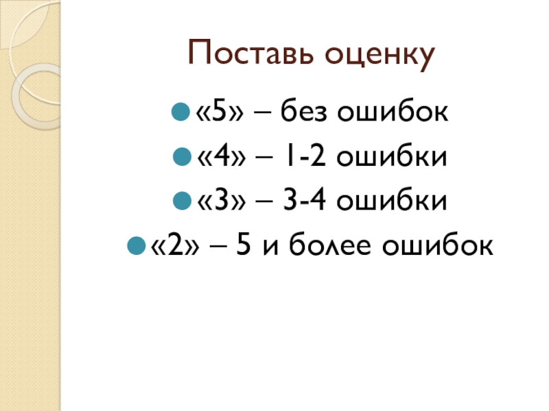 Поставь оценку«5» – без ошибок«4» – 1-2 ошибки«3» – 3-4 ошибки«2» – 5 и более ошибок
