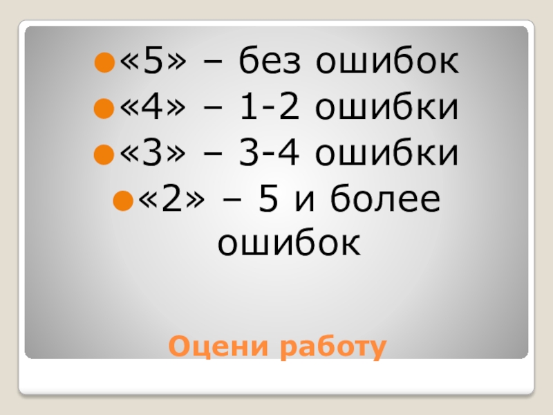 Оцени работу«5» – без ошибок«4» – 1-2 ошибки«3» – 3-4 ошибки«2» – 5 и более ошибок