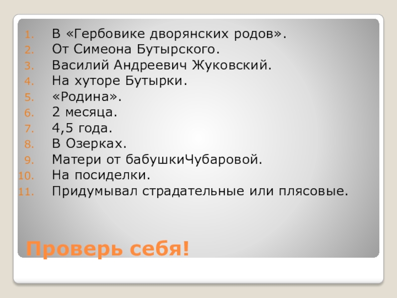 Проверь себя!В «Гербовике дворянских родов».От Симеона Бутырского.Василий Андреевич Жуковский.На хуторе Бутырки.«Родина».2 месяца.4,5 года.В Озерках.Матери от бабушкиЧубаровой.На посиделки.Придумывал