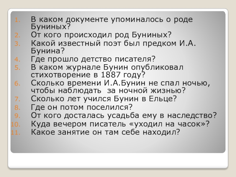 В каком документе упоминалось о роде Буниных?От кого происходил род Буниных?Какой известный поэт был предком И.А.Бунина?Где прошло детство писателя?В каком журнале Бунин опубликовал стихотворение в 1887 году?Сколько времени И.А.Бунин не спал ночью, чтобы наблюдать за ночной