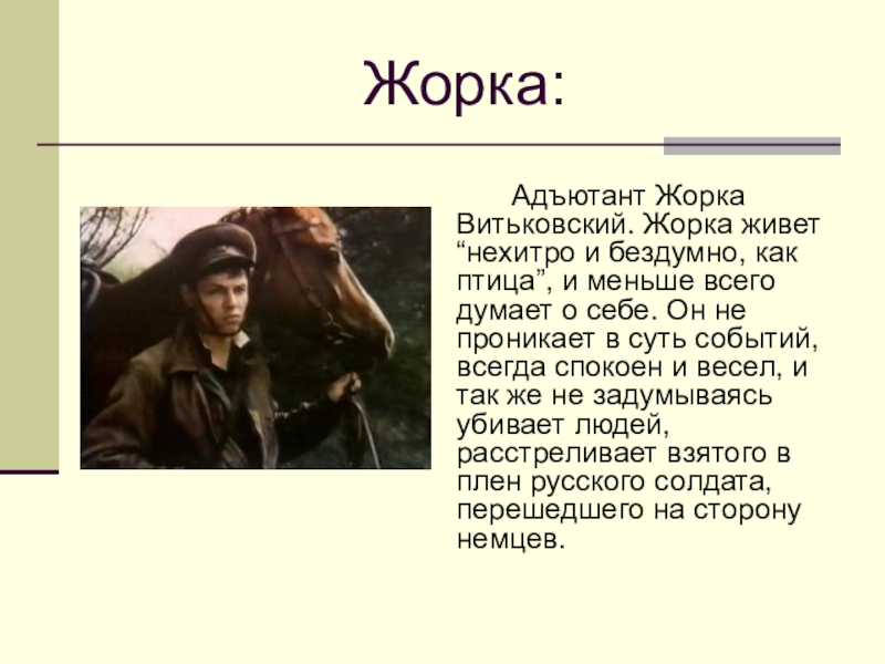 Адъютант Жорка Витьковский. Жорка живет “нехитро и бездумно, как птица”, и
