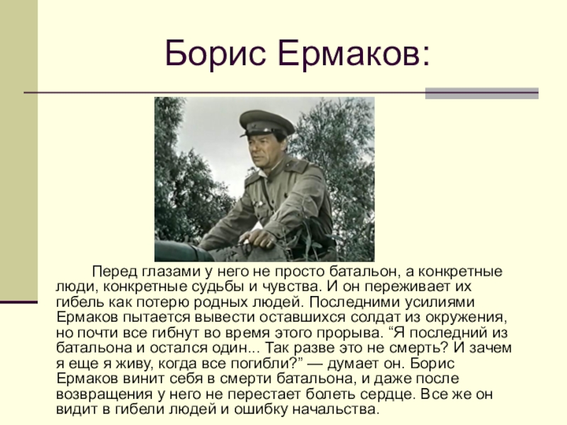 конкретные судьбы и чувства. И он переживает их гибель как потерю родных людей. Последними усилиями Ермаков пытается вывести оставшихся солдат из окружения, но почти все гибнут во время этого прорыва. “Я последний из батальона и остался один... Так разве это не смерть? И зачем я еще я живу, когда все погибли?” — думает он. Борис Ермаков винит себя в смерти батальона, и даже после возвращения у него не перестает болеть сердце. Все же он видит в гибели людей и ошибку начальства.
