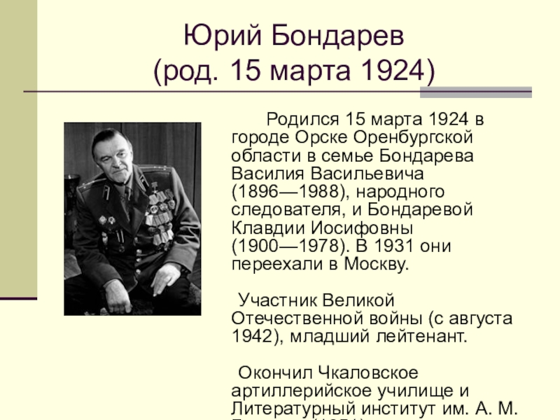 Слайд 1Юрий Васильевич Бондарев.