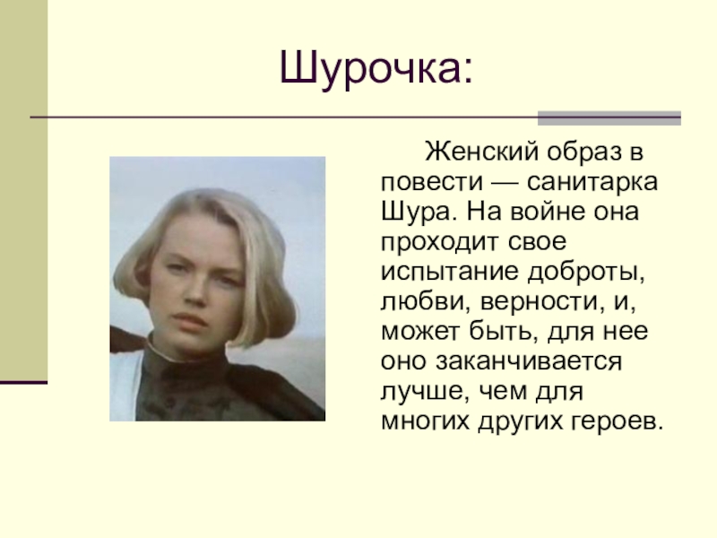 Женский образ в повести — санитарка Шура. На войне она проходит