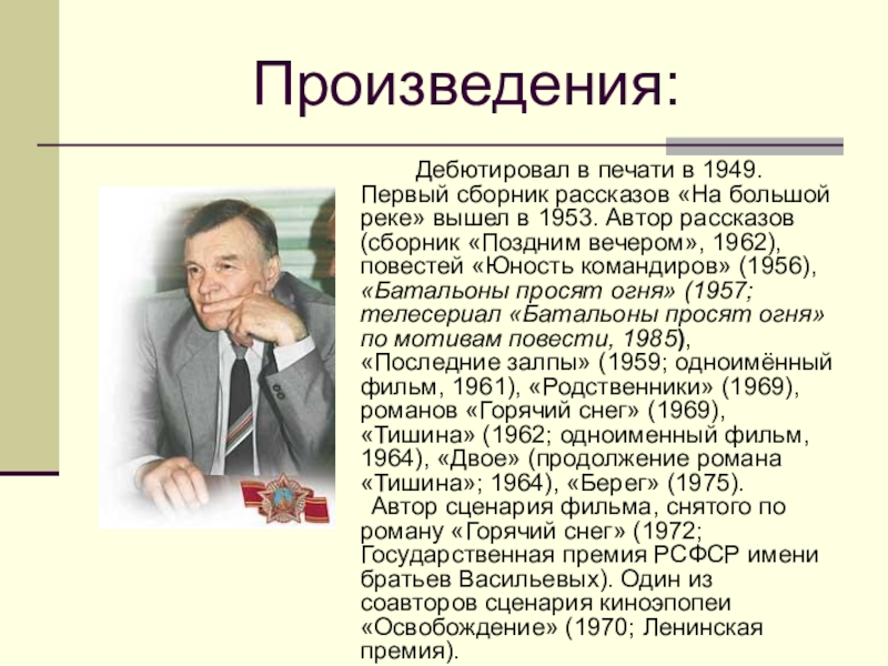 вышел в 1953. Автор рассказов (сборник «Поздним вечером», 1962), повестей «Юность командиров» (1956), «Батальоны просят огня» (1957; телесериал «Батальоны просят огня» по мотивам повести, 1985), «Последние залпы» (1959; одноимённый фильм, 1961), «Родственники» (1969), романов «Горячий снег» (1969), «Тишина» (1962; одноименный фильм, 1964), «Двое» (продолжение романа «Тишина»; 1964), «Берег» (1975).