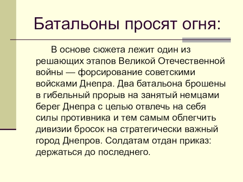 Отечественной войны — форсирование советскими войсками Днепра. Два батальона брошены в гибельный прорыв на занятый немцами берег Днепра с целью отвлечь на себя силы противника и тем самым облегчить дивизии бросок на стратегически важный город Днепров. Солдатам отдан приказ: держаться до последнего.