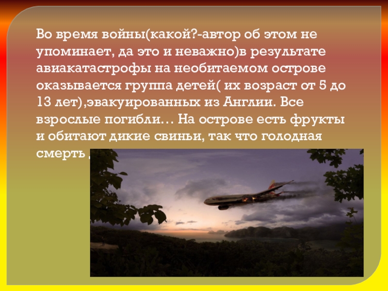 Слайд 10Напомним, почему дети оказываются на острове. Причина авиационной катастрофы-война, развязанная взрослыми.
