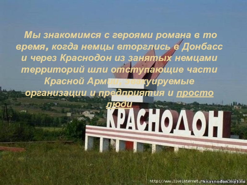 Донбассе, в оккупированном фашистами г.Краснодоне. Здесь велась героическая подпольная борьба. Арестами и казнями гитлеровцы пытались сломить волю и мужество советских людей. Живьём были закопаны в землю 32 краснодонских шахтёра. Но борьба продолжалась. А в сентябре 1942г. была создана тайная комсомольская организация «Молодая гвардия». Именно об этой организации и рассказывает в своём романе А.Фадеев.