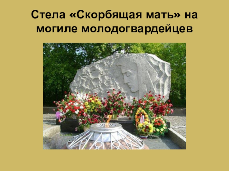 Слайд 15Стела «Скорбящая мать» на могиле молодогвардейцев
