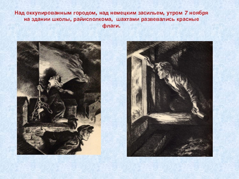 Слайд 12Над оккупированным городом, над немецким засильем, утром 7 ноября на здании