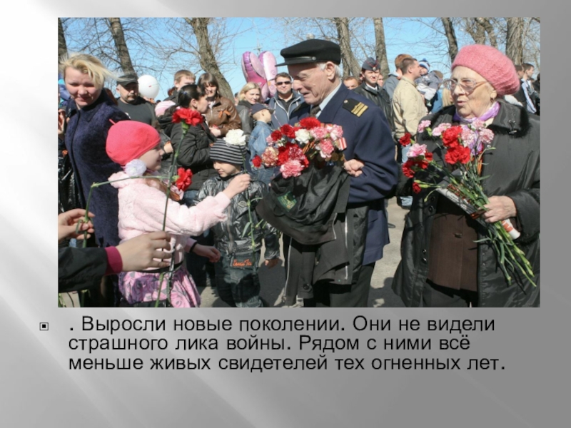 Слайд 3. Выросли новые поколении. Они не видели страшного лика войны. Рядом
