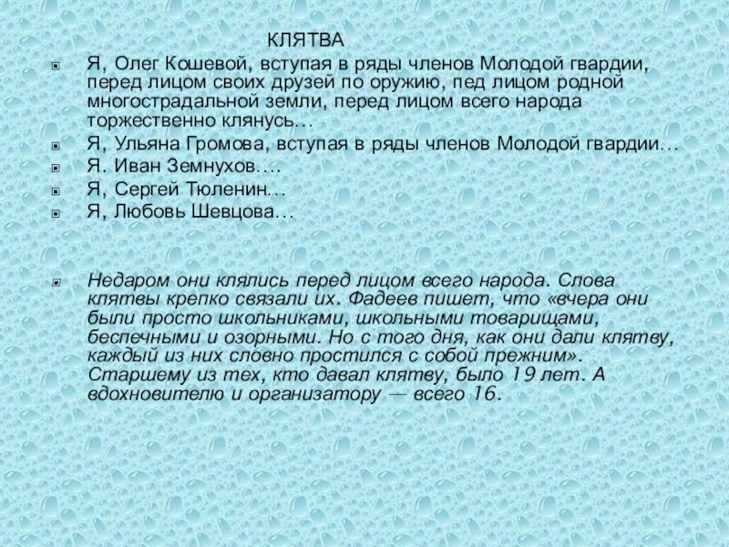 Я, Олег Кошевой, вступая в ряды членов Молодой гвардии, перед лицом своих друзей по оружию, пед лицом родной многострадальной земли, перед лицом всего народа торжественно клянусь…