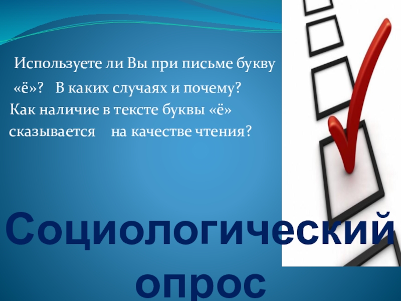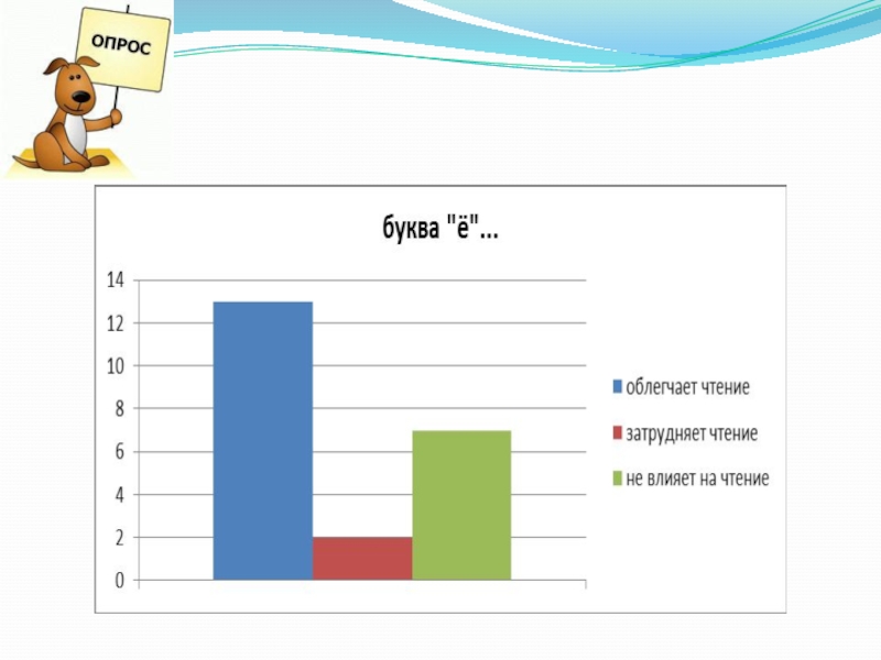 По результатам опроса и проведённого эксперимента, пришли к выводу, что наличие в тексте буквы «ё» улучшает качество чтения, а именно скорость и понимание.