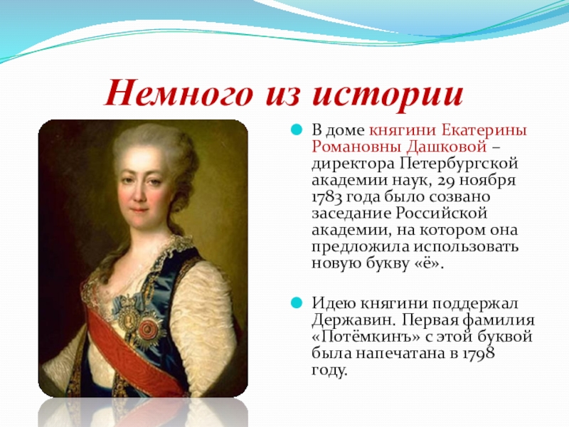 академии наук, 29 ноября 1783 года было созвано заседание Российской академии, на котором она предложила использовать новую букву «ё».