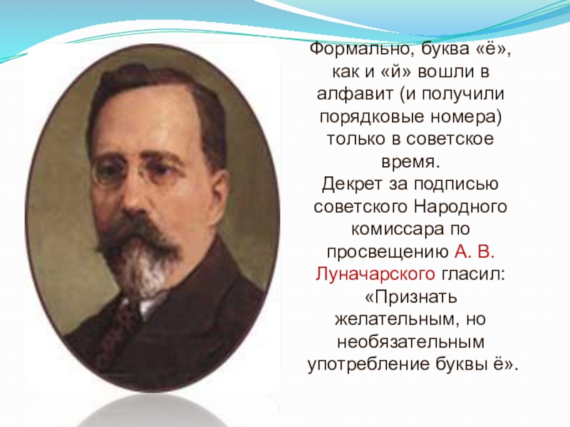 Декрет за подписью советского Народного комиссара по просвещению А. В. Луначарского гласил: «Признать желательным, но необязательным употребление буквы ё».