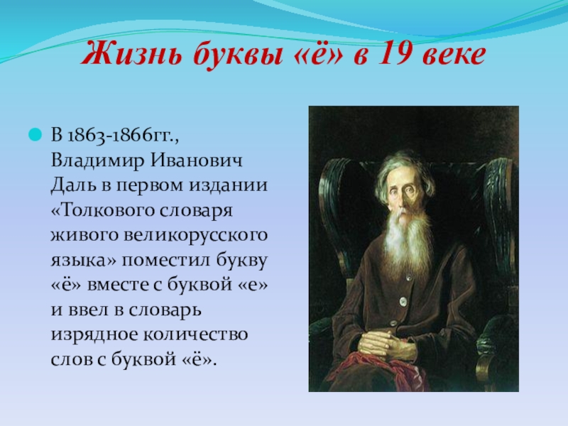 первом издании «Толкового словаря живого великорусского языка» поместил букву «ё» вместе с буквой «е» и ввел в словарь изрядное количество слов с буквой «ё».