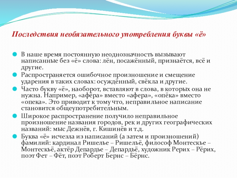 Слайд 9Последствия необязательного употребления буквы «ё»