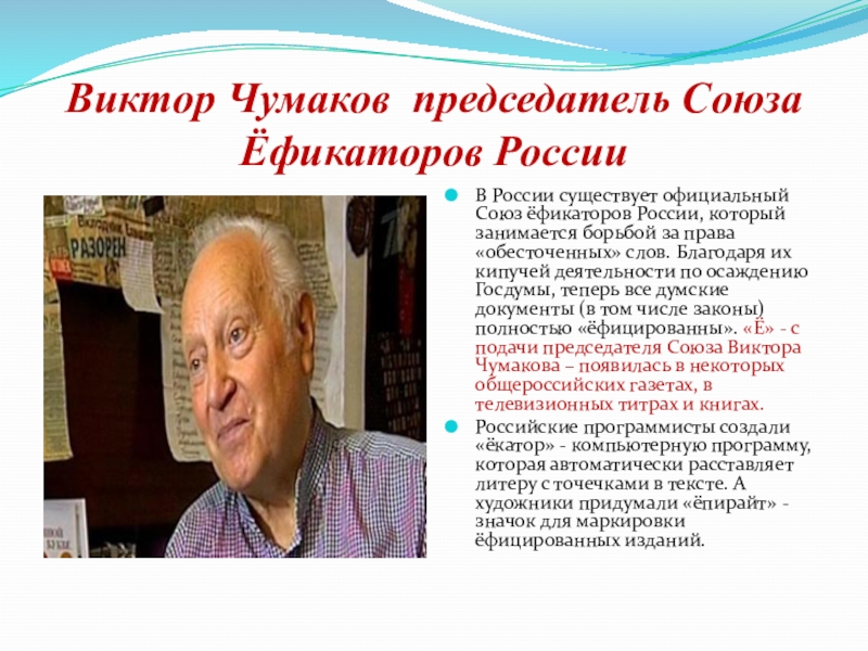 России, который занимается борьбой за права «обесточенных» слов. Благодаря их кипучей деятельности по осаждению Госдумы, теперь все думские документы (в том числе законы) полностью «ёфицированны». «Ё» - с подачи председателя Союза Виктора Чумакова – появилась в некоторых общероссийских газетах, в телевизионных титрах и книгах.