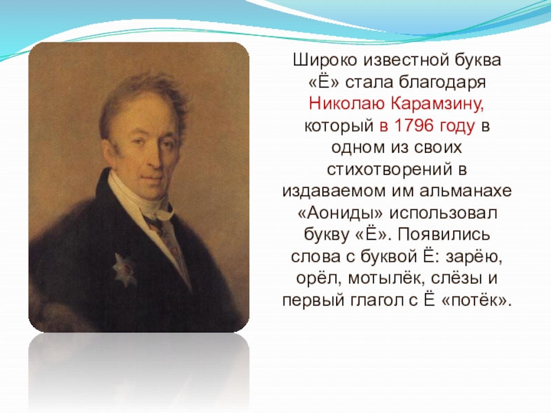 Слайд 5Широко известной буква «Ё» стала благодаря Николаю Карамзину, который в 1796