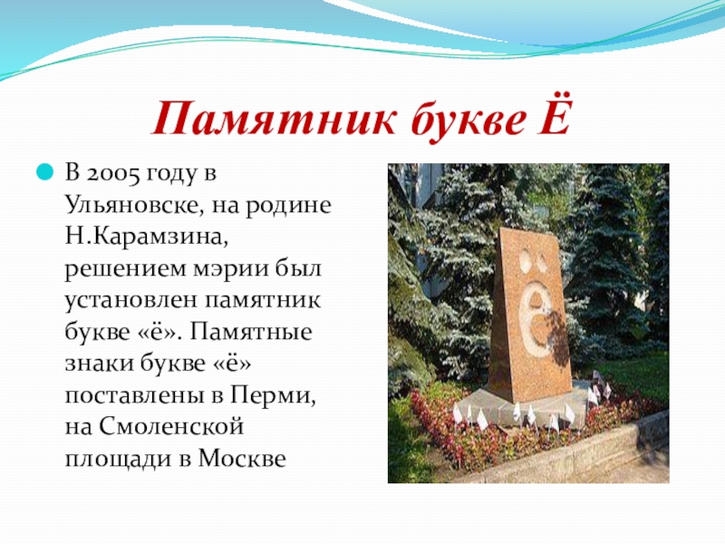 мэрии был установлен памятник букве «ё». Памятные знаки букве «ё» поставлены в Перми, на Смоленской площади в Москве