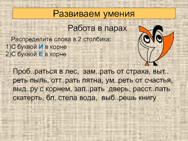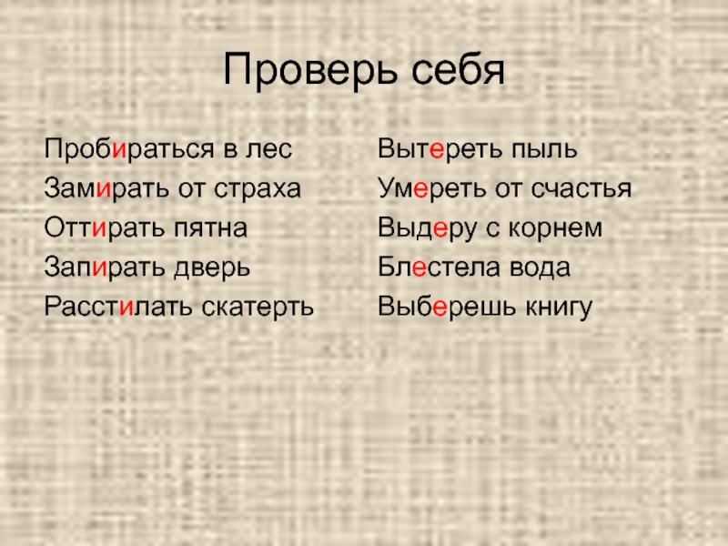 Проб..раться в лес, зам..рать от страха, выт..реть пыль, отт..рать пятна, ум..реть от счастья, выд..ру с корнем, зап..рать дверь, расст..лать скатерть, бл..стела вода, выб..решь книгу