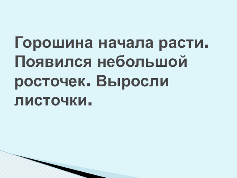 Слайд 7 Горошина начала расти. Появился небольшой росточек. Выросли листочки.